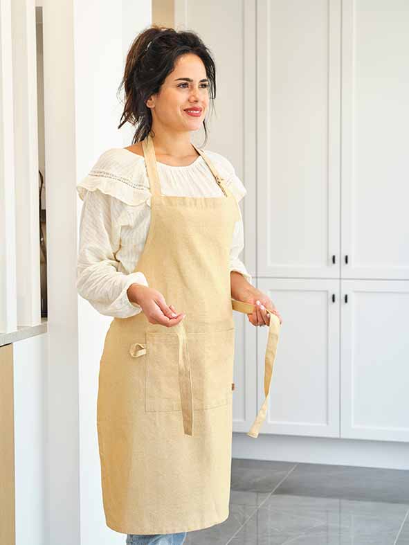 Deze mooie keukenschort van Cosy & Trendy in het prachtige Amber Gold is onmisbaar en prachtig van kleur om je gasten te ontvangen op een BBQ bij je thuis of op een gezellige avond in huis.