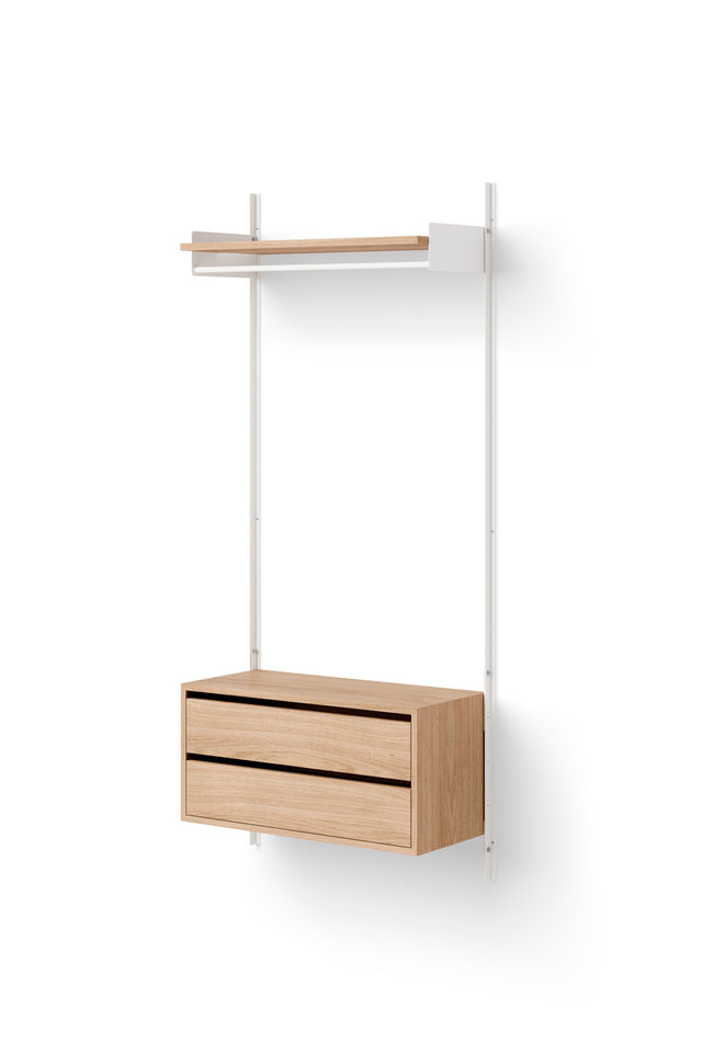- Onderdelen: 1 x NW Wandstang, 1900 (set van 2), 1 x NW Diepe plank, 1 x NW Garderobekasthouder, 1 x NW Lage kast met laden en 1 x NW Kasthouder.