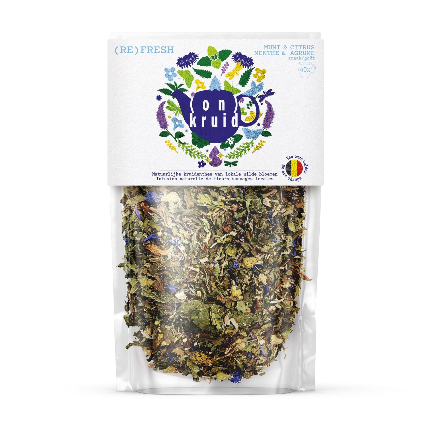 Ingrediënten: groene munt, veldzuring, grote brandnetel, gewoon duizendblad, citroenmelisse en korenbloem.