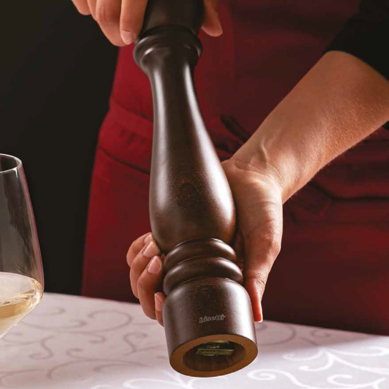 Met veel precisie maalt zij peper. Het hout is van zeer goede kwaliteit, want het komt uit Europa.