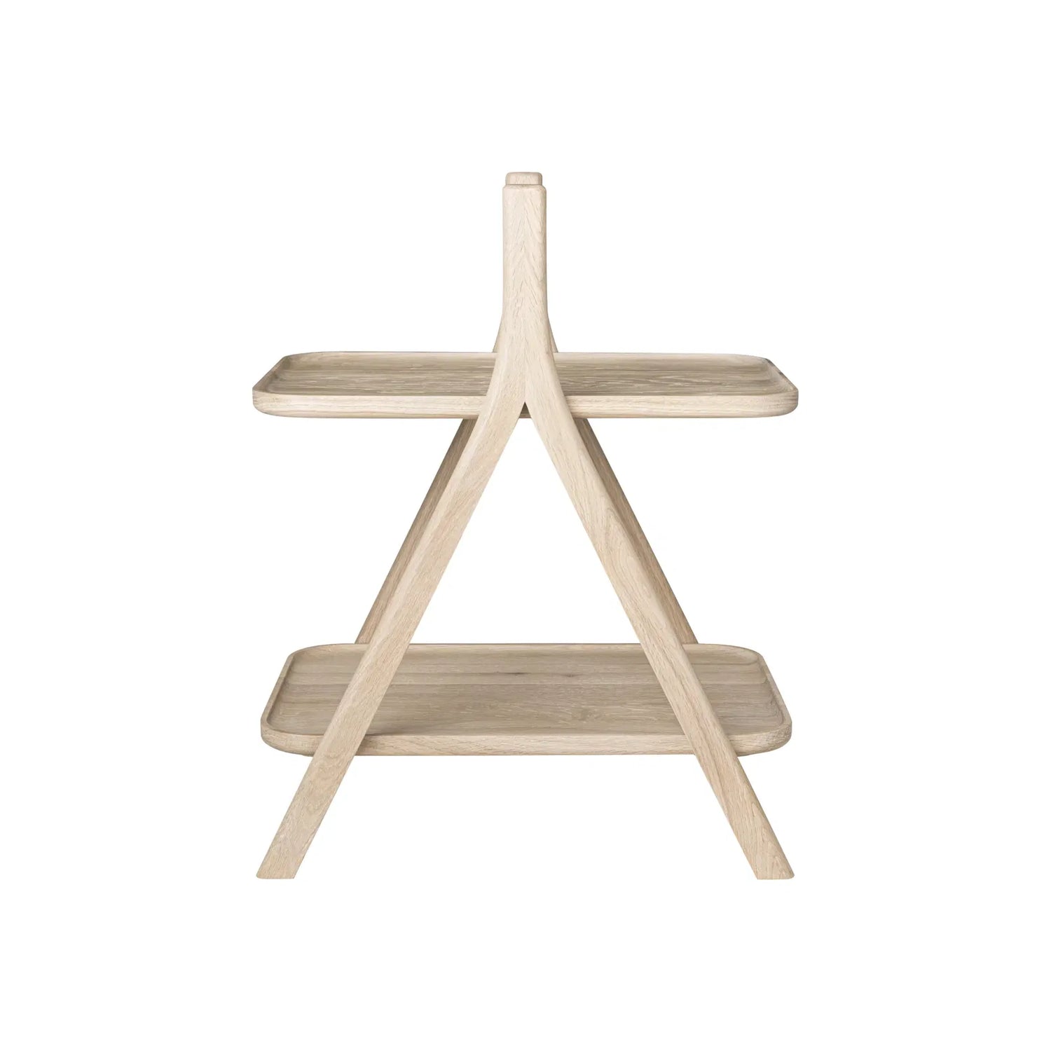 De ovale handgreep en de poten met dezelfde radius vormen een open 'A-frame', terwijl de twee planken een zwevend effect creëren.